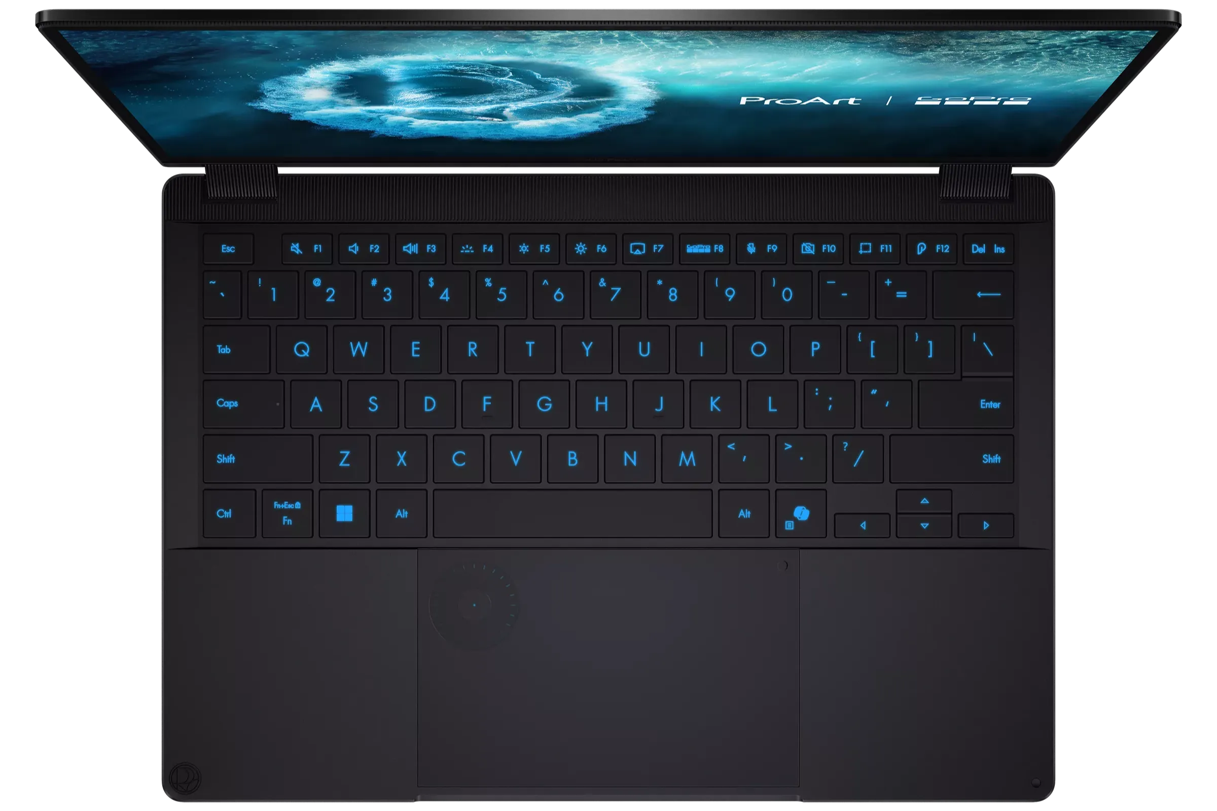 From the moment you unbox the PX13, you’re greeted by a design that feels straight out of a sci-fi epic. The Nano black aluminium chassis is accented with CNC-engraved horizontal lines, echoing the ribbed surfaces of advanced spacecraft and GoPro’s rugged cameras. Bold cyan keyboard backlighting and a glowing DialPad indicator evoke the illuminated control panels of tomorrow’s starships, while subtle ProArt and GoPro logos keep the look stealthy and professional.